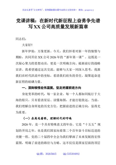 / 党课讲稿:在新时代新征程上奋勇争先谱写XX公司高质量发展新篇章