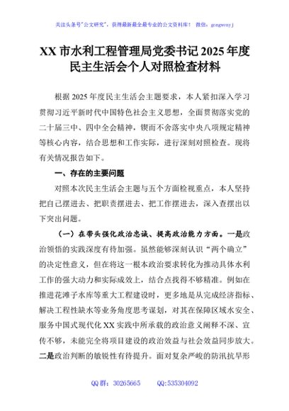 / XX市水利工程管理局党委书记2025年度民主生活会个人对照检查材料