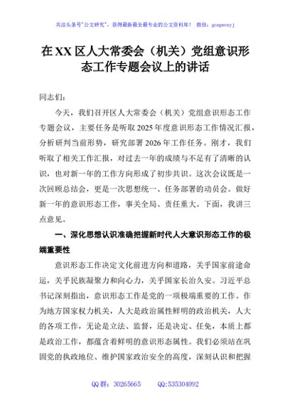 / 在XX区人大常委会(机关)党组意识形态工作专题会议上的讲话