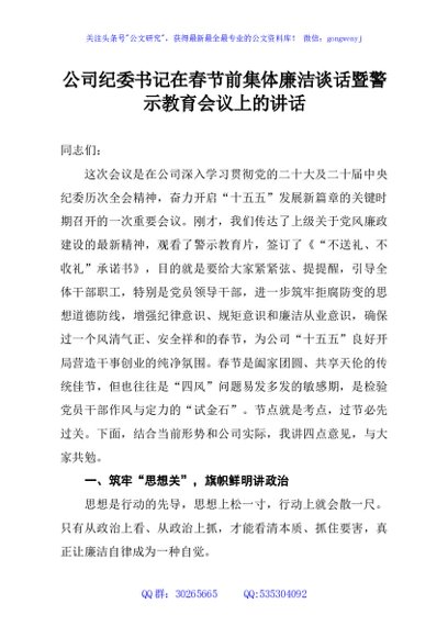 / 公司纪委书记在春节前集体廉洁谈话暨警示教育会议上的讲话