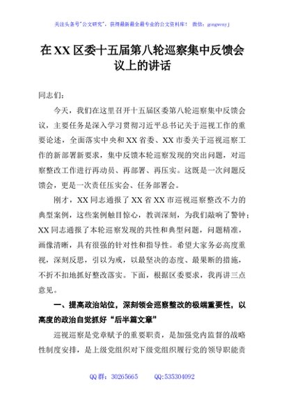 / 在XX区委十五届第八轮巡察集中反馈会议上的讲话