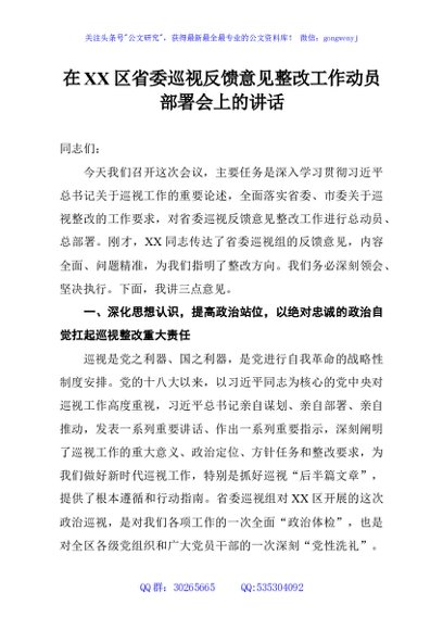 / 在XX区省委巡视反馈意见整改工作动员部署会上的讲话