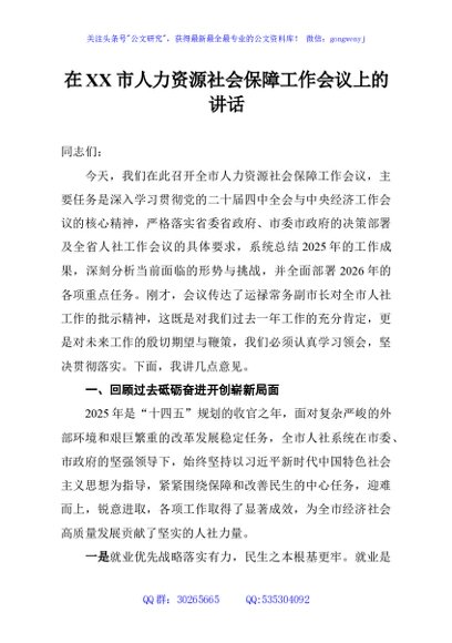 / 在XX市人力资源社会保障工作会议上的讲话