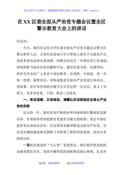 / 在XX区委全面从严治党专题会议暨全区警示教育大会上的讲话