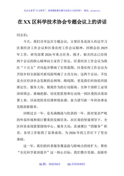 / 在XX区科学技术协会专题会议上的讲话