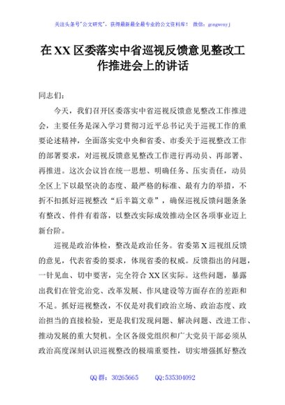 / 在XX区委落实中省巡视反馈意见整改工作推进会上的讲话