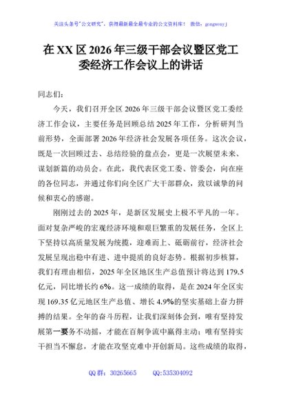 / 在XX区2026年三级干部会议暨区党工委经济工作会议上的讲话