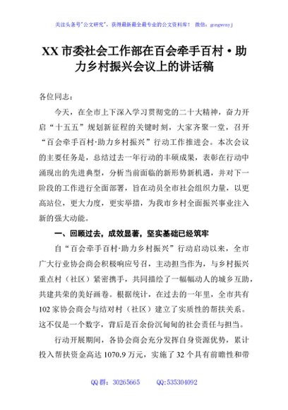 / XX市委社会工作部在百会牵手百村·助力乡村振兴会议上的讲话稿