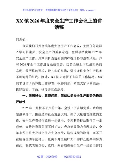 / XX镇2026年度安全生产工作会议上的讲话稿