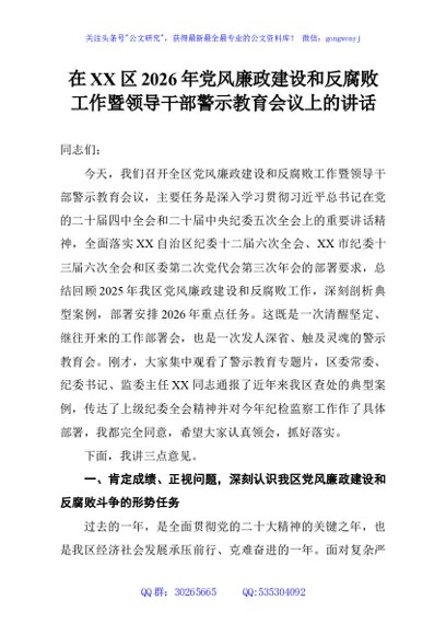 / 在XX区2026年党风廉政建设和反腐败工作暨领导干部警示教育会议上的讲话