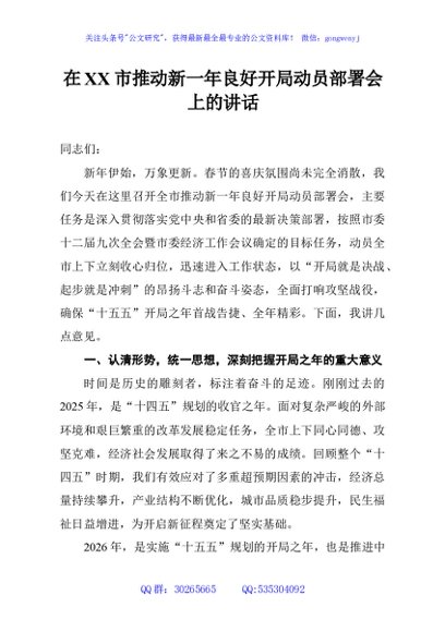 / 在XX市推动新一年良好开局动员部署会上的讲话