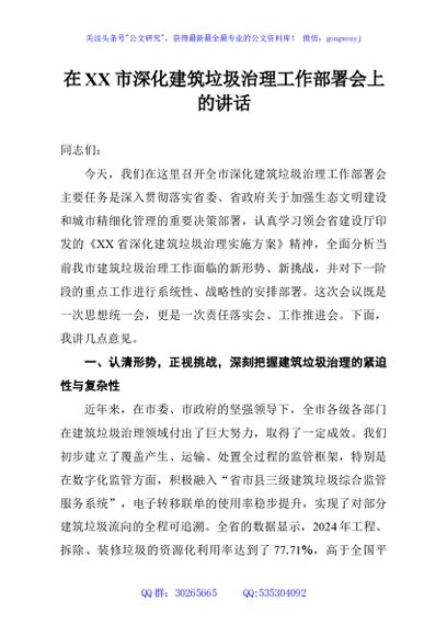 / 在XX市深化建筑垃圾治理工作部署会上的讲话