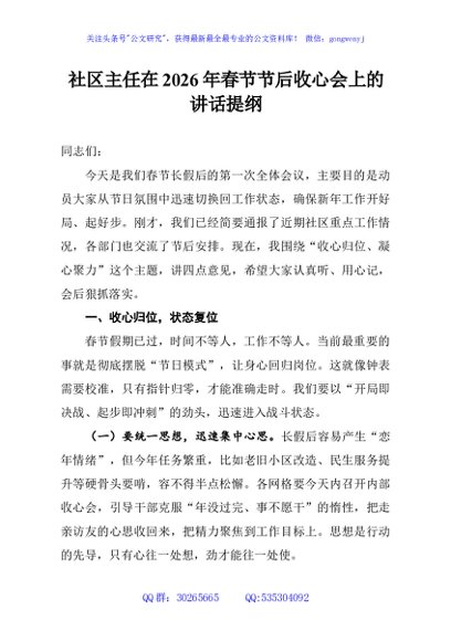 / 社区主任在2026年春节节后收心会上的讲话提纲