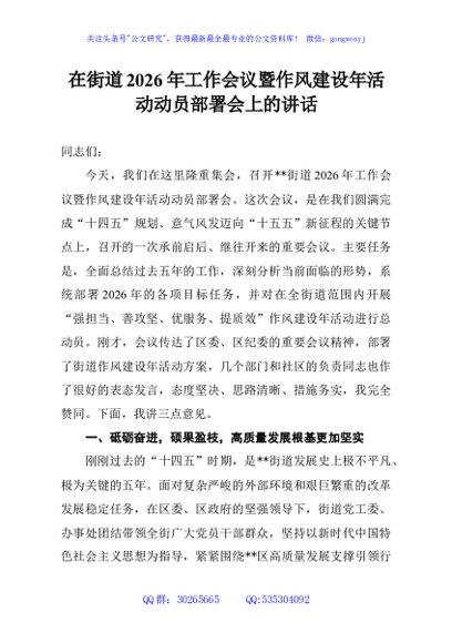 / 在街道2026年工作会议暨作风建设年活动动员部署会上的讲话