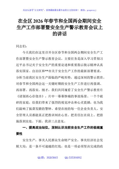 / 在全区2026年春节和全国两会期间安全生产工作部署暨安全生产警示教育会议上的讲话