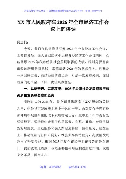 / XX市人民政府在2026年全市经济工作会议上的讲话