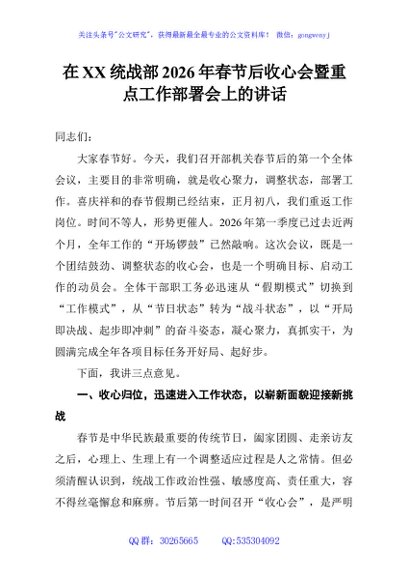 / 在XX统战部2026年春节后收心会暨重点工作部署会上的讲话
