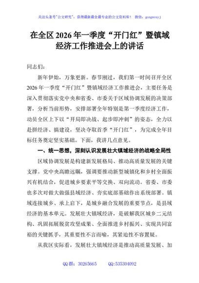 / 在全区2026年一季度“开门红”暨镇域经济工作推进会上的讲话