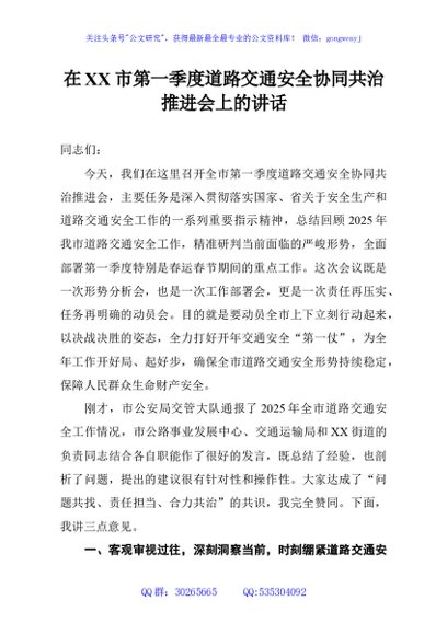 / 在XX市第一季度道路交通安全协同共治推进会上的讲话