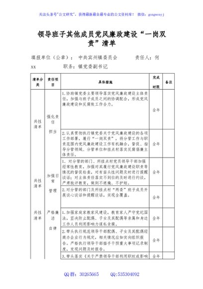 领导班子其他成员党风廉政建设“一岗双责”清单
