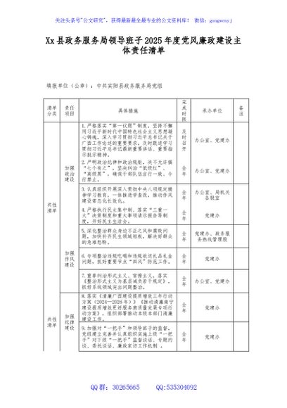 / Xx县政务服务局领导班子2025年度党风廉政建设主体责任清单