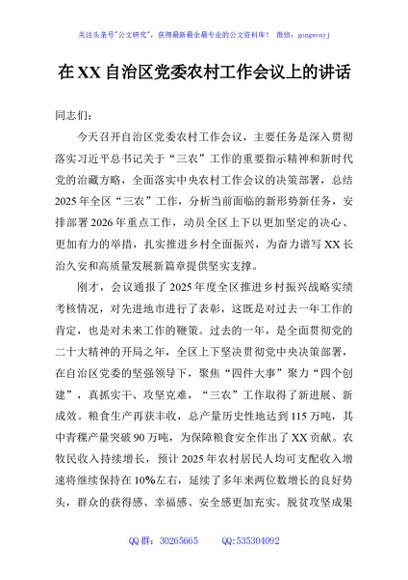 / 在XX自治区党委农村工作会议上的讲话