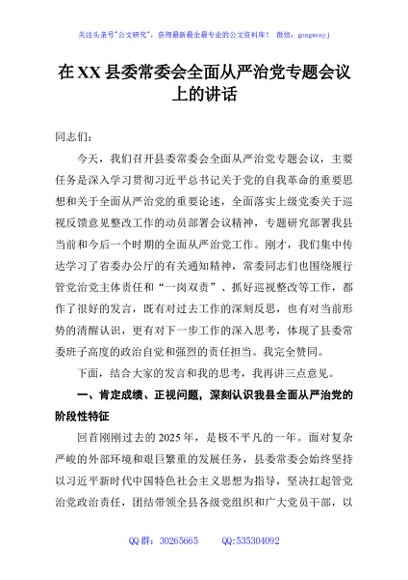 / 在XX县委常委会全面从严治党专题会议上的讲话