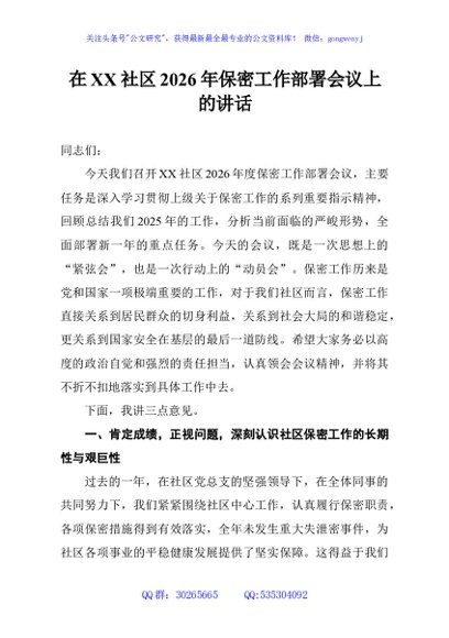 / 在XX社区2026年保密工作部署会议上的讲话