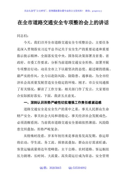 / 在全市道路交通安全专项整治会上的讲话