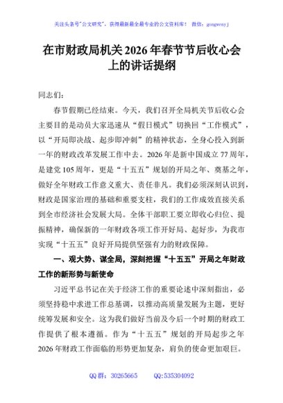 / 在市财政局机关2026年春节节后收心会上的讲话提纲