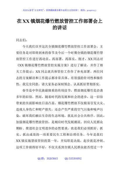 / 在XX镇烟花爆竹燃放管控工作部署会上的讲话