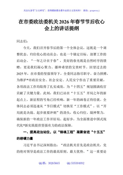 / 在市委政法委机关2026年春节节后收心会上的讲话提纲