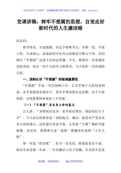 / 党课讲稿:树牢不想腐的思想,自觉走好新时代的人生廉洁路