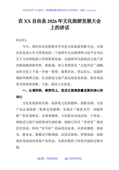 / 在XX自治县2026年文化旅游发展大会上的讲话