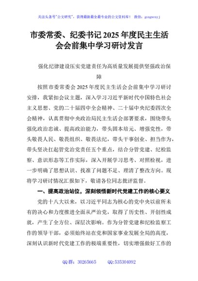 / 市委常委、纪委书记2025年度民主生活会会前集中学习研讨发言