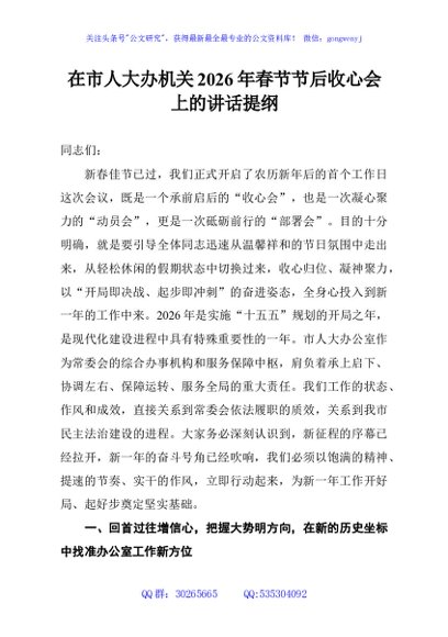 / 在市人大办机关2026年春节节后收心会上的讲话提纲