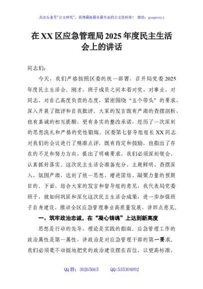 / 在XX区应急管理局2025年度民主生活会上的讲话