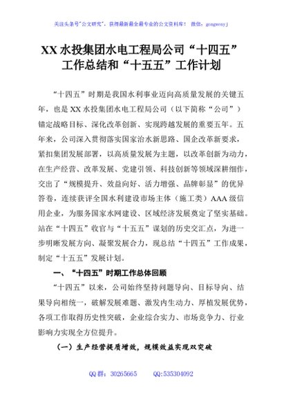 / XX水投集团水电工程局公司“十四五”工作总结和“十五五”工作计划
