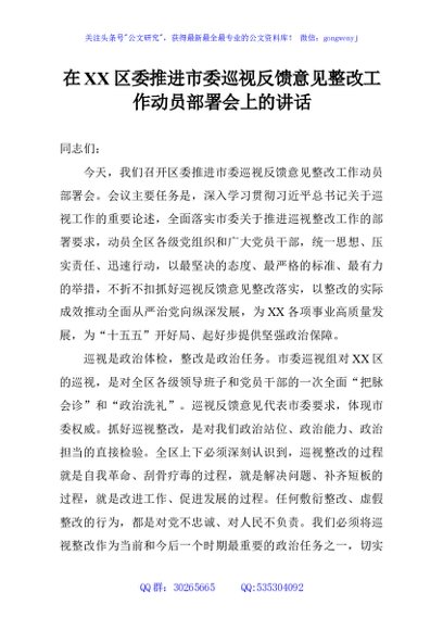 / 在XX区委推进市委巡视反馈意见整改工作动员部署会上的讲话