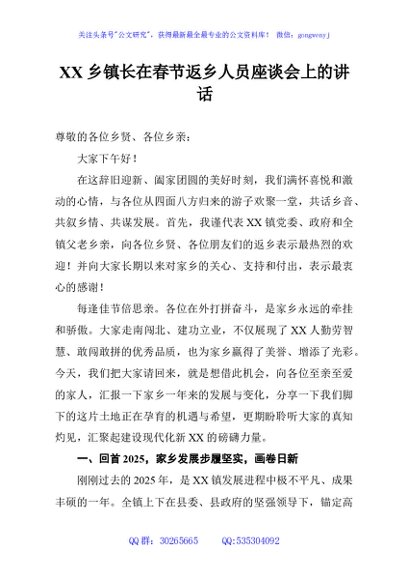 / XX乡镇长在春节返乡人员座谈会上的讲话