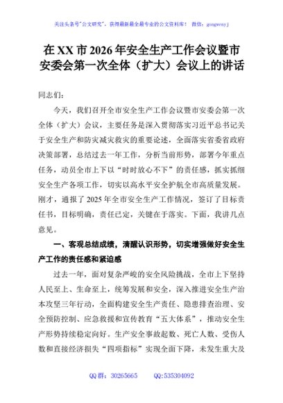 / 在XX市2026年安全生产工作会议暨市安委会第一次全体(扩大)会议上的讲话