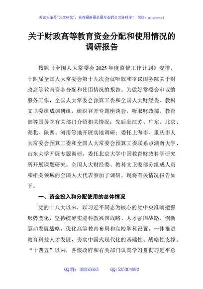 / 关于财政高等教育资金分配和使用情况的调研报告