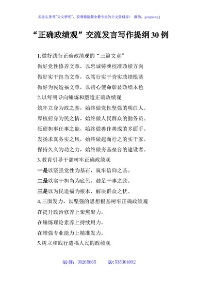 / “正确政绩观”交流发言写作提纲30例