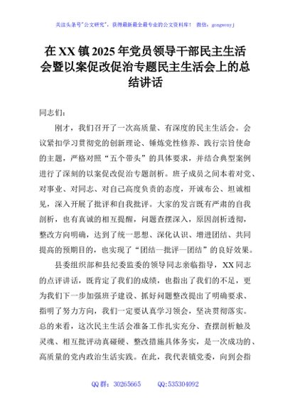 / 在XX镇2025年党员领导干部民主生活会暨以案促改促治专题民主生活会上的总结讲话