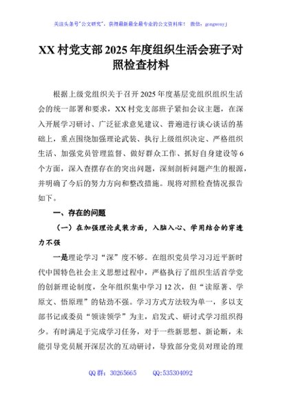 / XX村党支部2025年度组织生活会班子对照检查材料