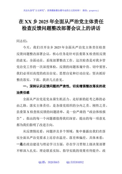 / 在XX乡2025年全面从严治党主体责任检查反馈问题整改部署会议上的讲话