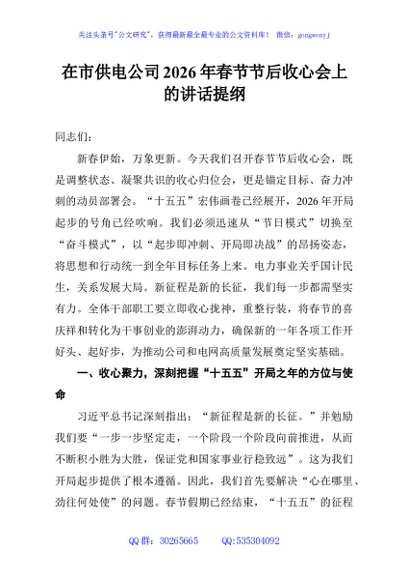 / 在市供电公司2026年春节节后收心会上的讲话提纲