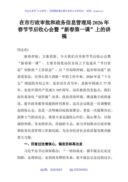 / 在市行政审批和政务信息管理局2026年春节节后收心会暨“新春第一课”上的讲稿