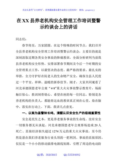 / 在XX县养老机构安全管理工作培训暨警示约谈会上的讲话
