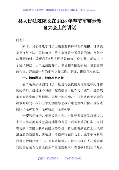 / 县人民法院院长在2026年春节前警示教育大会上的讲话